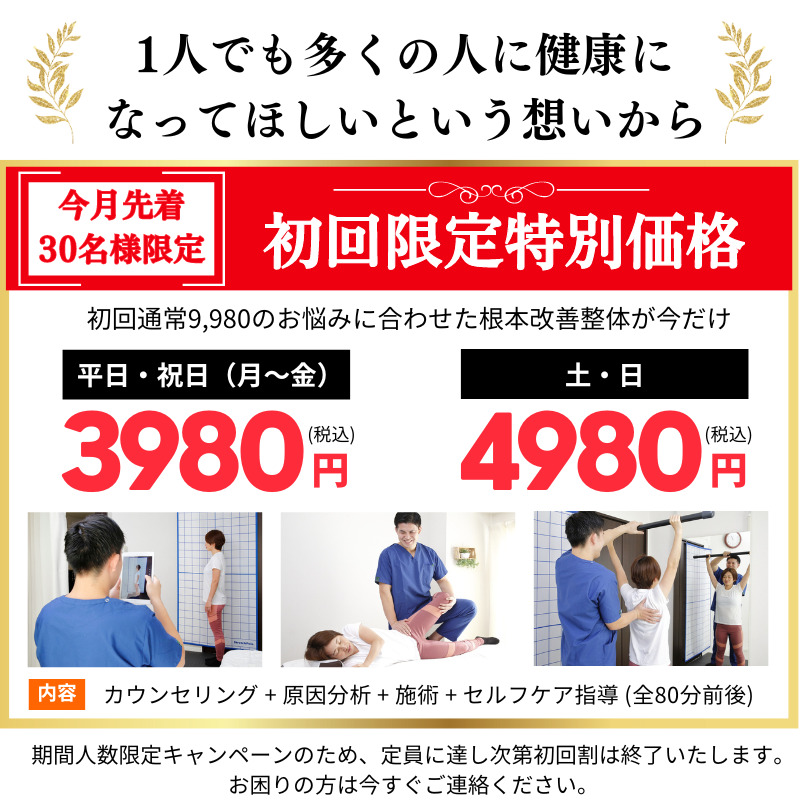 治療院選びで悩む方の不安を少しでも解消できればと思い期間限定ではありますが下記キャンペーンをご用意しております。お悩みの方は今すぐご連絡ください。