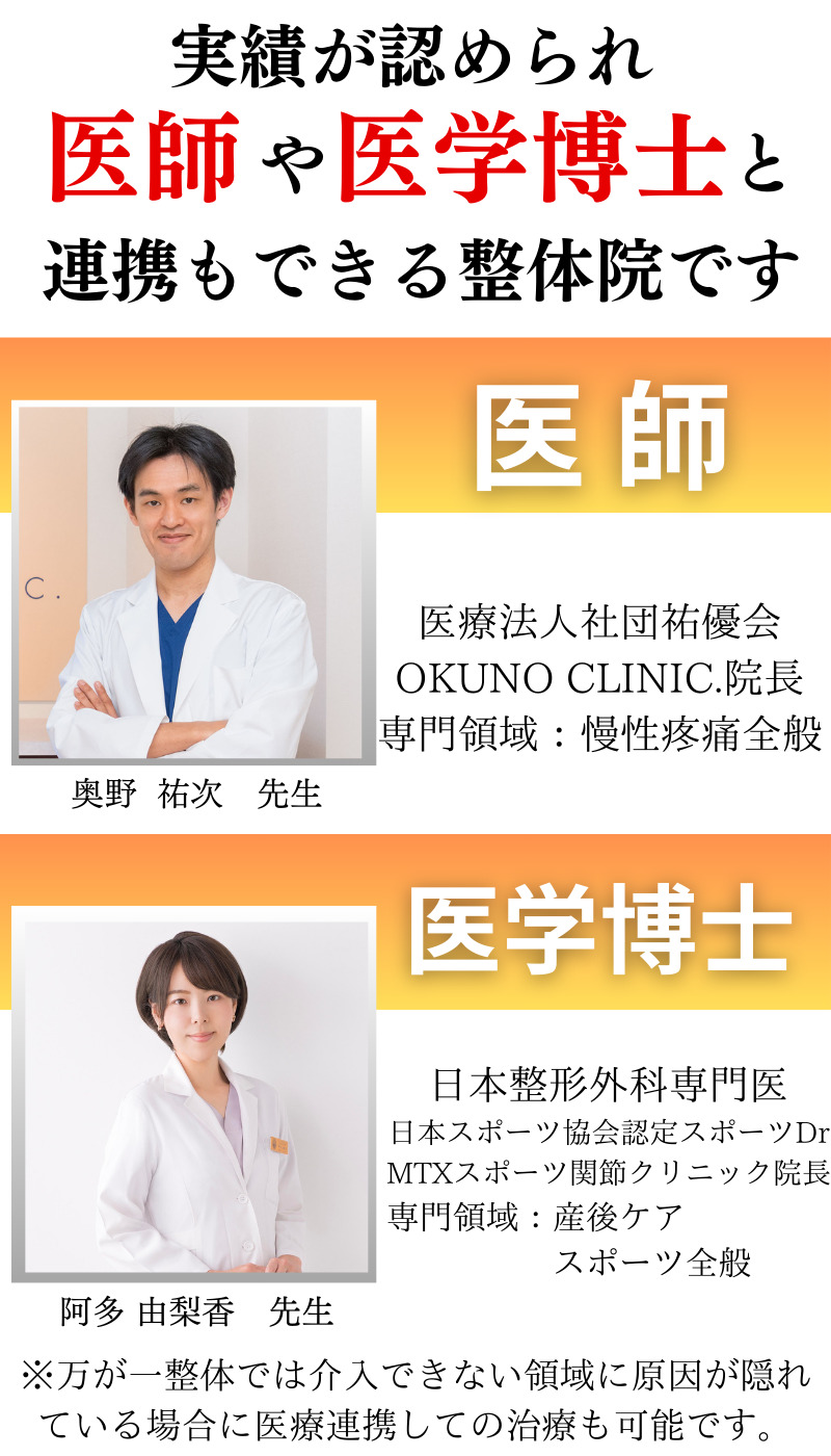 原因を見つけた上で、施術前に状態と治療説明をしてから施術するので皆さん「こんなわかりやすく説明されたの初めて」とご好評いただいており、安心・納得して施術を受けていただけます。・
