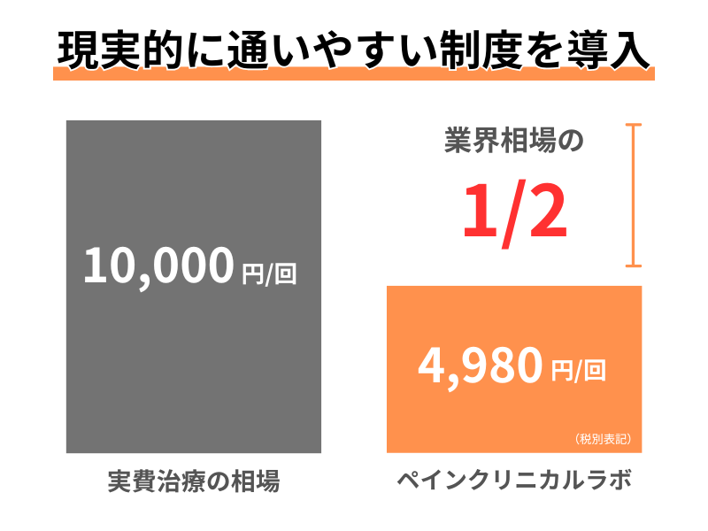 良い状態を定着していくには、最低でも月に2回以上きていただいた方が効果を最大限実感いただく方が多いことから、当院ではご負担費用を相場よりも抑えて通えるシステムを導入しています。